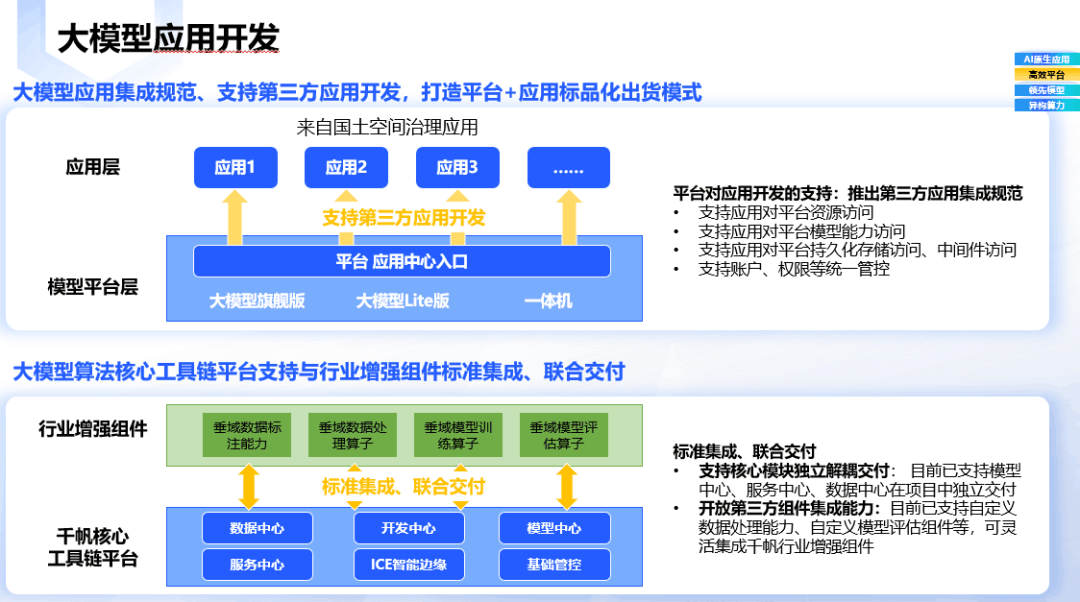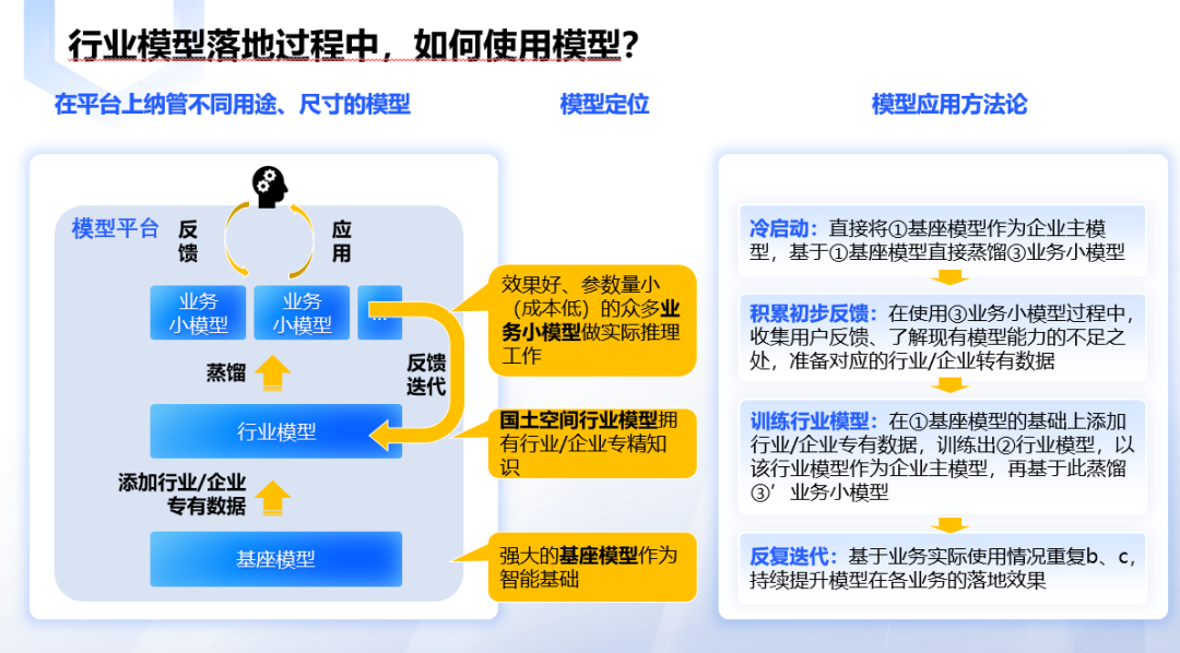 “模型矩阵”有别于传统单一大模型应用框架及思路,通过组合和协同多个不同规格、不同专长的大模型,通过分工、协作与精细化运营,实现了在复杂业务场景中成本、效率与效果的平衡。他提出了一个层次分明、协同高效的技术框架——构建涵盖基座模型、行业模型与小业务模型的三级模型平台应用体系。该体系通过全方位、多维度的能力支撑,显著优化了空间治理场景中的模型应用效果,为实际业务落地实践提供了解决方案。