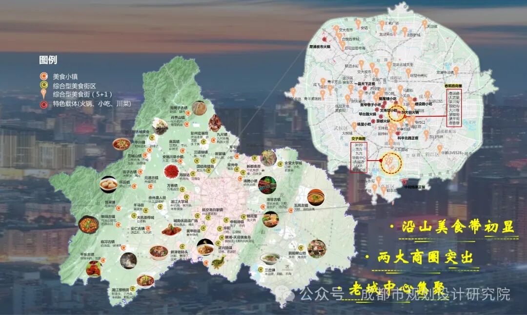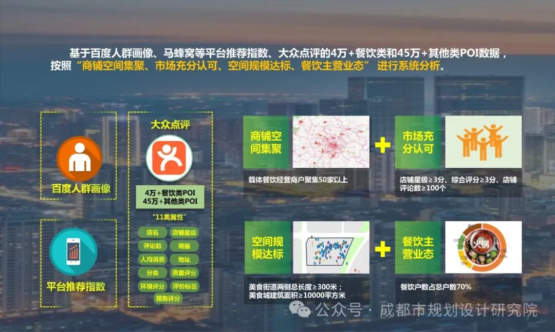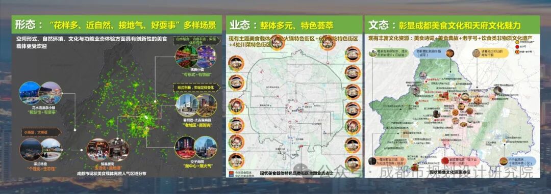 为落实三城三都、国际消费中心城市建设要求,在市人大、市商务局、市规划和自然资源局的指导下,我院开展《成都国际美食之都美食载体规划建设导则》编制研究,旨在以国际美食之都美食载体建设为抓手,弘扬川派美食神韵、荟萃国内外美食精华。美食载体是美食店铺集聚的消费空间。为科学规划,《导则》基于百度人群画像、马蜂窝等平台推荐指数、大众点评的4万+餐饮类和45万+其他类POI数据,按照“商铺空间集聚、市场充分认可、空间规模达标、餐饮主营业态”的原则进行系统分析,形成了成都美食现状地图。成都美食空间分布格局呈现: