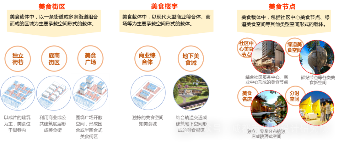 《导则》针对建设形式,提出美食街区、美食楼宇、美食节点三种美食载体类型,从空间营造、业态引导、文化塑造进行分类指引。